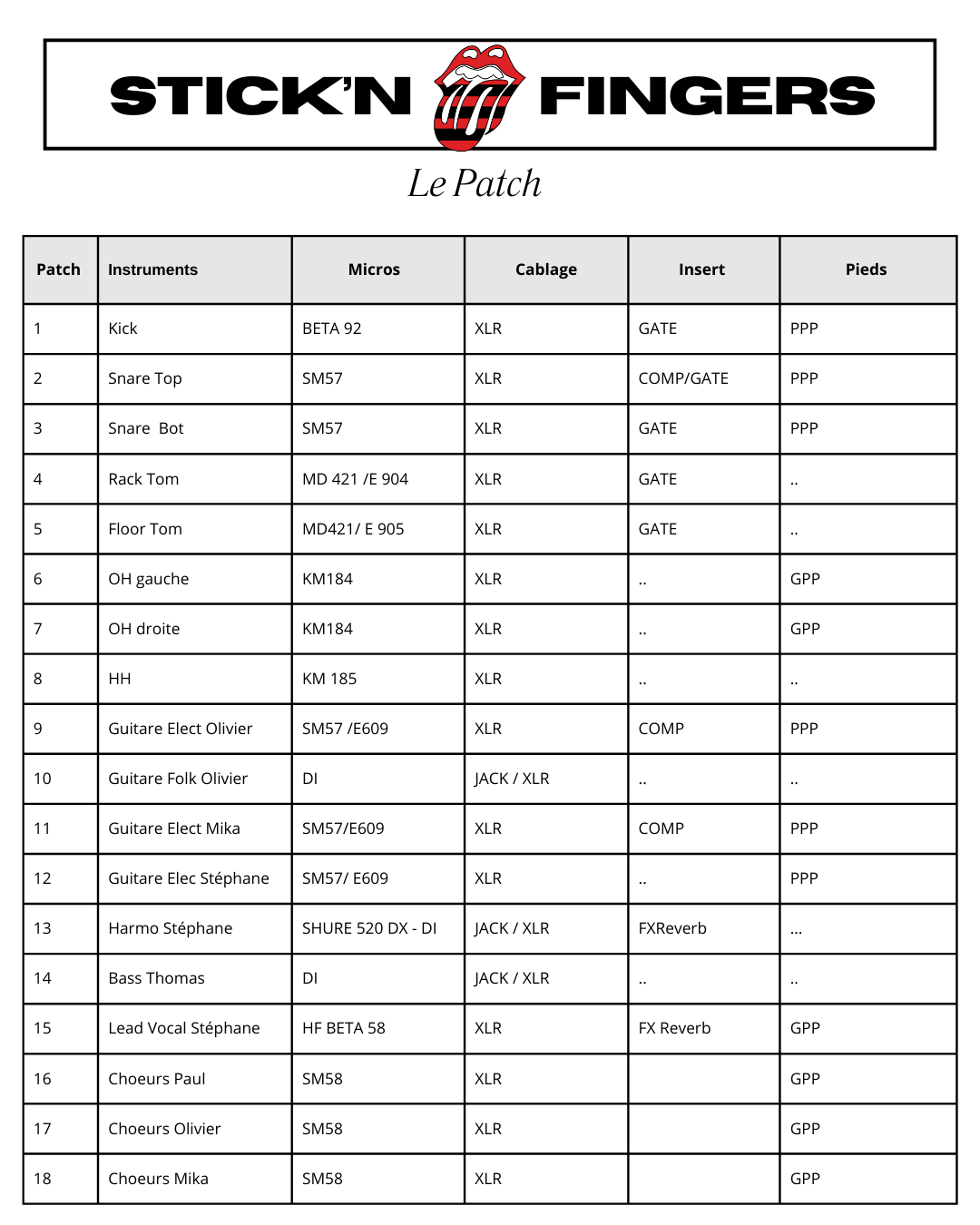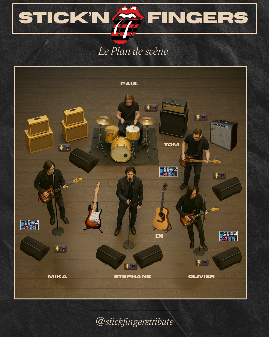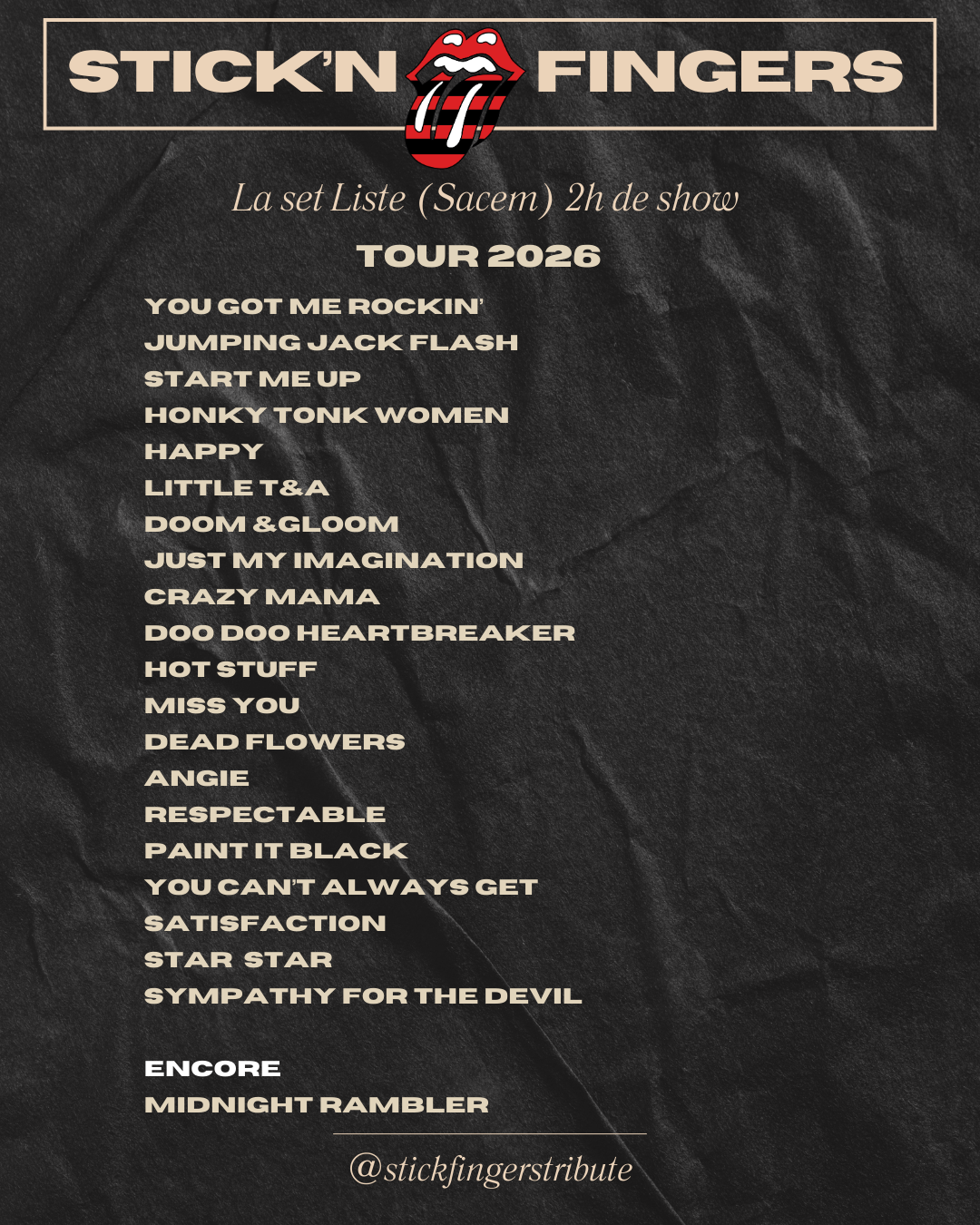 Depuis 2015 le groupe organise chaque année de véritables tournées de 20 à 30 Concerts à la belle Saison partout en France. Des débuts balbutiants dans les Bars de Bretagne aux concerts d'aujourd'hui devant plusieurs milliers de personnes, les STICK'N FINGERS ont toujours privilégié LA PERFORMANCE LIVE et la rencontre avec leur public FANS des STONES. Ni Sosie Ni Parodie mais authentiques et bluffants, les Shows durent parfois jusqu'à 2h30 retraçant l'énergie communicative de l'âge d'or du Rock des années 70. Avec 2,5 K followers sur les réseaux sociaux, doté d'un Fan club de 400 membres, le groupe est reconnu comme le plus festif, et l'un des tout meilleur hommage aux Rolling Stones actif en France.
